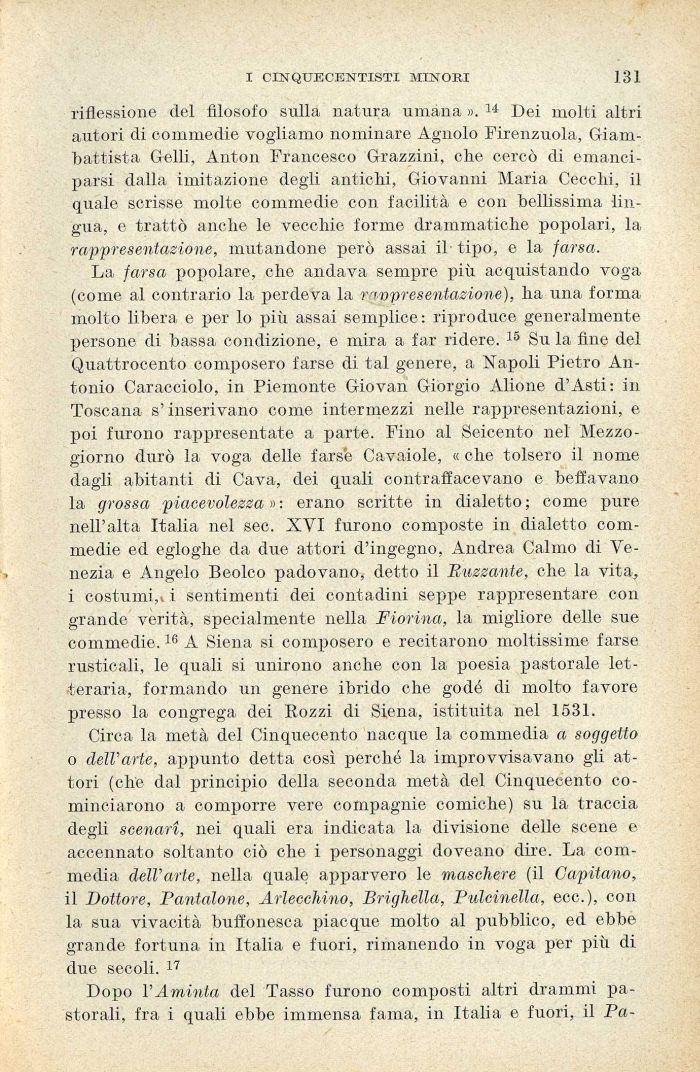 riflessione del filosofo sulla natura umana ». 14 Dei molti altri autori di commedie vogliamo nominare Agnolo Firenzuola, Giambattista Gelli, Anton Francesco Grazzini, che cercò di emanciparsi dalla imitazione degli antichi, Giovanni Maria Cecchi, il quale scrisse molte commedie con facilità e con bellissima lingua, e trattò anche le vecchie forme drammatiche popolari, la rappresentazione, mutandone però assai il- tipo, e la farsa.