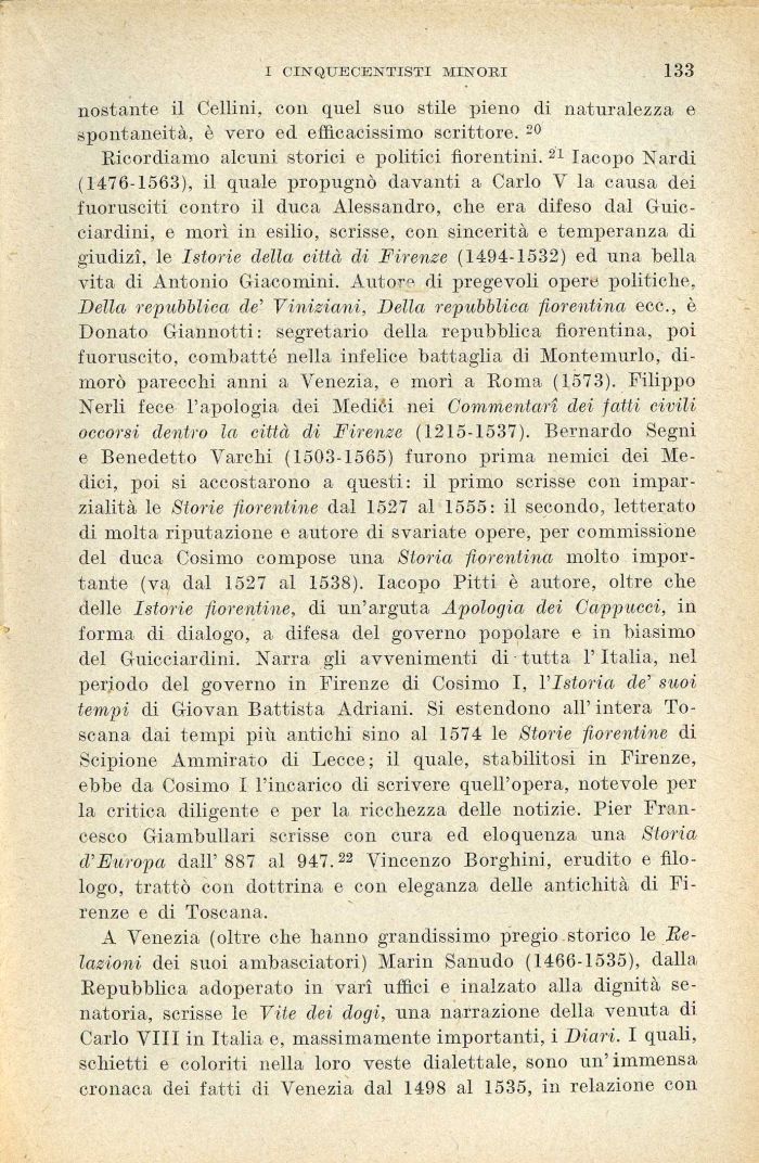 Ricordiamo alcuni storici e politici fiorentini. 21 Iacopo Nardi (1476-1563), il quale propugnò davanti a Carlo V la causa dei fuorusciti contro il duca Alessandro, che era difeso dal Guicciardini, e mori in esilio, scrisse, con sincerità e temperanza di giudizi, le Istorie della città di Firenze (1494-1532) ed una bella vita di Antonio Giacomini. Autore di pregevoli opere politiche, Della repubblica de' Viniziani, Della repubblica fiorentina ecc., è Donato Giannotti : segretario della repubblica fiorentina, poi fuoruscito, combatté nella infelice battaglia di Montemurlo, dimorò parecchi anni a Venezia, e morì a Roma (1573). Filippo Nerli fece l'apologia dei Mediéi nei Commentari dei fatti civili occorsi dentro la città di Firenze (1215-1537). Bernardo Segni e Benedetto Varchi (1503-1565) furono prima nemici dei Medici, poi si accostarono a questi: il primo scrisse con imparzialità le Storie fiorentine dal 1527 al 1555: il secondo, letterato di molta riputazione e autore di svariate opere, per commissione del duca Cosimo compose una Storia fiorentina molto importante (va dal 1527 al 1538). Iacopo Pitti è autore, oltre che delle Istorie fiorentine, di un'arguta Apologia dei Cappucci, in forma di dialogo, a difesa del governo popolare e in biasimo del Guicciardini. Narra gli avvenimenti di - tutta l'Italia, nel periodo del governo in Firenze di Cosimo I, l'Istoria de' suoi tempi di Giovan Battista Adriani. Si estendono all' intera Toscana dai tempi più antichi sino al 1574 le Storie fiorentine di Scipione Ammirato di Lecce; il quale, stabilitosi in Firenze, ebbe da Cosimo I l'incarico di scrivere quell'opera, notevole per la critica diligente e per la ricchezza delle notizie. Pier Francesco Giambullari scrisse con cura ed eloquenza una Storia d'Europa dall'887 al 947.22 Vincenzo Borghini, erudito e filologo, trattò con dottrina e con eleganza delle antichità di Firenze e di Toscana.