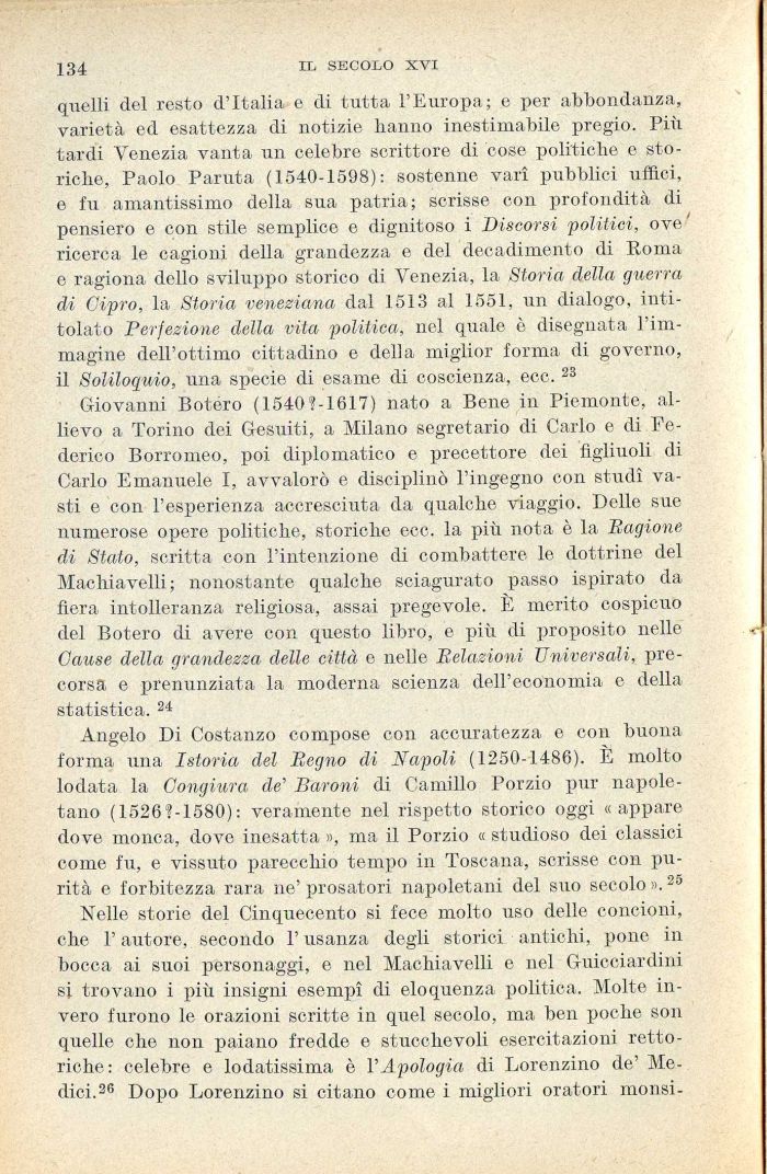 Nelle storie del Cinquecento si fece molto uso delle concioni, che l'autore, secondo l'usanza degli storici antichi, pone in bocca ai suoi personaggi, e nel Machiavelli e nel Guicciardini si trovano i più insigni esempì di eloquenza politica. Molte invero furono le orazioni scritte in quel secolo, ma ben poche son quelle che non paiano fredde e stucchevoli esercitazioni retto-riche: celebre e lodatissima è l'Apologia di Lorenzino de' Medici.28 Dopo Lorenzino si citano come i migliori oratori monsi-