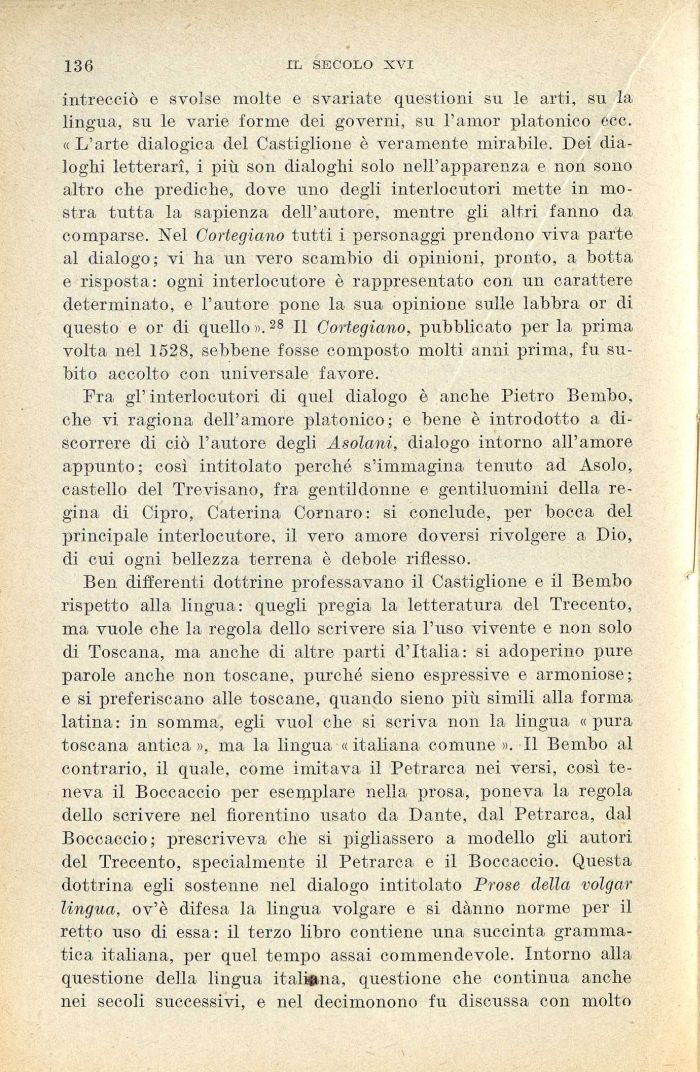 Ben differenti dottrine professavano il Castiglione e il Bembo rispetto alla lingua: quegli pregia la letteratura del Trecento, ma vuole che la regola dello scrivere sia l'uso vivente e non solo di Toscana, ma anche di altre parti d'Italia: si adoperino pure parole anche non toscane, purché sieno espressive e armoniose; e si preferiscano alle toscane, quando sieno più simili alla forma latina: in somma, egli vuol che si scriva non la lingua «pura toscana antica», ma la lingua « italiana comune ». Il Bembo al contrario, il quale, come imitava il Petrarca nei versi, così teneva il Boccaccio per esemplare nella prosa, poneva la regola dello scrivere nel fiorentino usato da Dante, dal Petrarca, dal Boccaccio; prescriveva che si pigliassero a modello gli autori del Trecento, specialmente il Petrarca e il Boccaccio. Questa dottrina egli sostenne nel dialogo intitolato Prose della volgar lingua, ov'è difesa la lingua volgare e si danno norme per il retto uso di essa: il terzo libro contiene una succinta grammatica italiana, per quel tempo assai commendevole. Intorno alla questione della lingua italiana, questione che continua anche nei secoli successivi, e nel decimonono fu discussa con molto