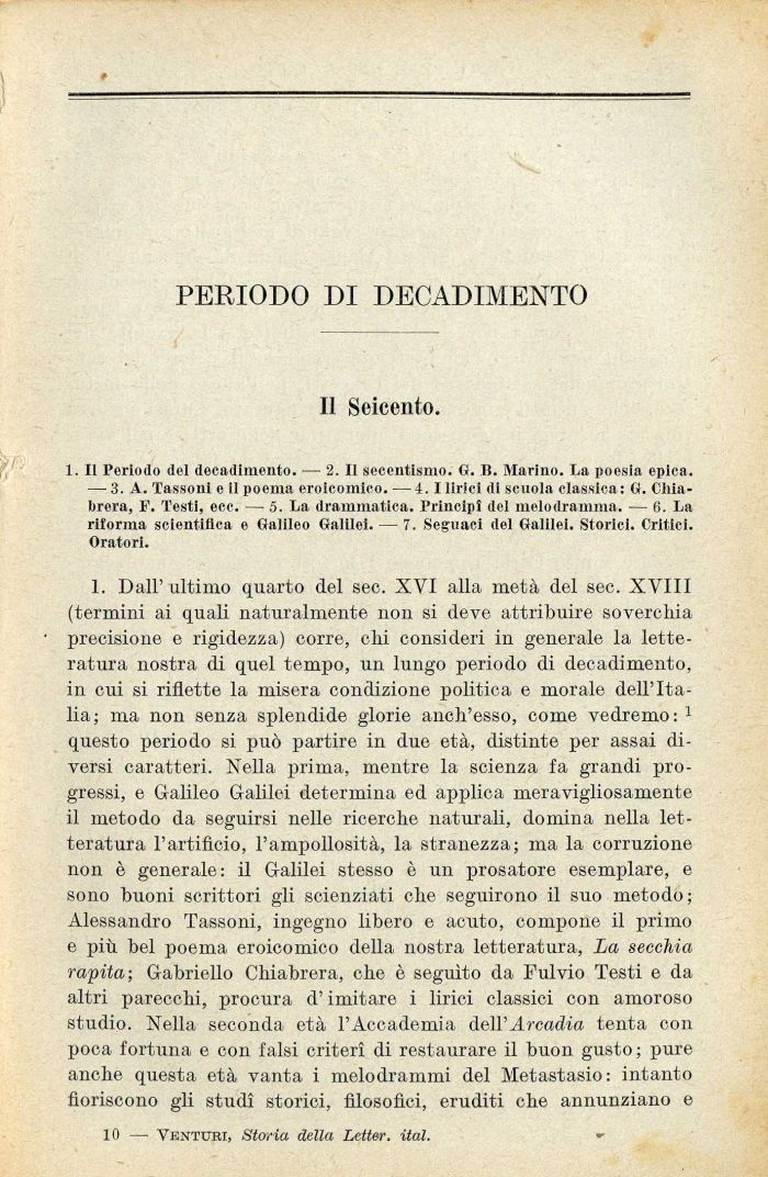 1. II Periodo del decadimento. — 2. Il secentismo. G. B. Marino. La poesia epica. — 3. A. Tassoni e il poema eroicomico. — 4.1 lirici di scuola classica: G. Cliia-brera, F. Testi, ecc. — 5. La drammatica. Principi del melodramma. — 6. La riforma scientifica e Galileo Galilei. — 7. Seguaci del Galilei. Storici. Critici. Oratori.