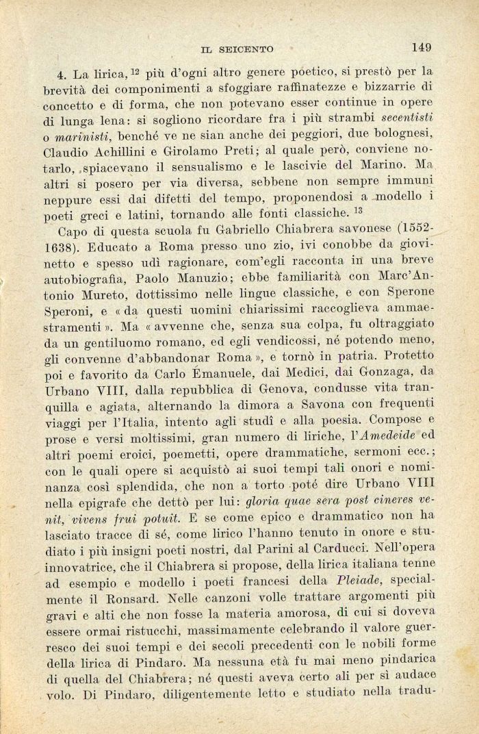Capo di questa scuola fu Gabriello Cliiabrera savonese ( 1552-1638). Educato a Poma presso uno zio, ivi conobbe da giovinetto e spesso udì ragionare, com'egli racconta in una breve autobiografìa, Paolo Manuzio; ebbe familiarità con Marc'Antonio Mureto, dottissimo nelle lingue classiche, e con Sperone Speroni, e « da questi uomini chiarissimi raccoglieva ammaestramenti ». Ma « avvenne che, senza sua colpa, fu oltraggiato da un gentiluomo romano, ed egli vendicossi, né potendo meno, gli convenne d'abbandonar Roma », e tornò in patria. Protetto poi e favorito da Carlo Emanuele, dai Medici, dai Gonzaga, da Urbano VIII, dalla repubblica di Genova, condusse vita tranquilla e agiata, alternando la dimora a Savona con frequenti viaggi per l'Italia, intento agli studi e alla poesia. Compose e prose e versi moltissimi, gran numero di liriche, VAmedeide ed altri poemi eroici, poemetti, opere drammatiche, sermoni ecc. ; con le quali opere si acquistò ai suoi tempi tali onori e nominanza così splendida, che non a torto potè dire Urbano Vili nella epigrafe che dettò por lui: gloria quae sera post cineres ve-nit, vivens frui potuit. E se come epico e drammatico non ha lasciato tracce di sé, come lirico l'hanno tenuto in onore e studiato i più insigni poeti nostri, dal Parini al Carducci. Nell'opera innovatrice, che il Cliiabrera si propose, della lirica italiana tenne ad esempio e modello i poeti francesi della Pleiade, specialmente il Ronsard. Nelle canzoni volle trattare argomenti più gravi e alti che non fosse la materia amorosa, di cui si doveva essere ormai ristucchi, massimamente celebrando il valore guerresco dei suoi tempi e dei secoli precedenti con le nobili forme della lirica di Pindaro. Ma nessuna età fu mai meno pindarica di quella del Chiabrera; né questi aveva certo ali per sì audace volo. Di Pindaro, diligentemente letto e studiato nella tradu-