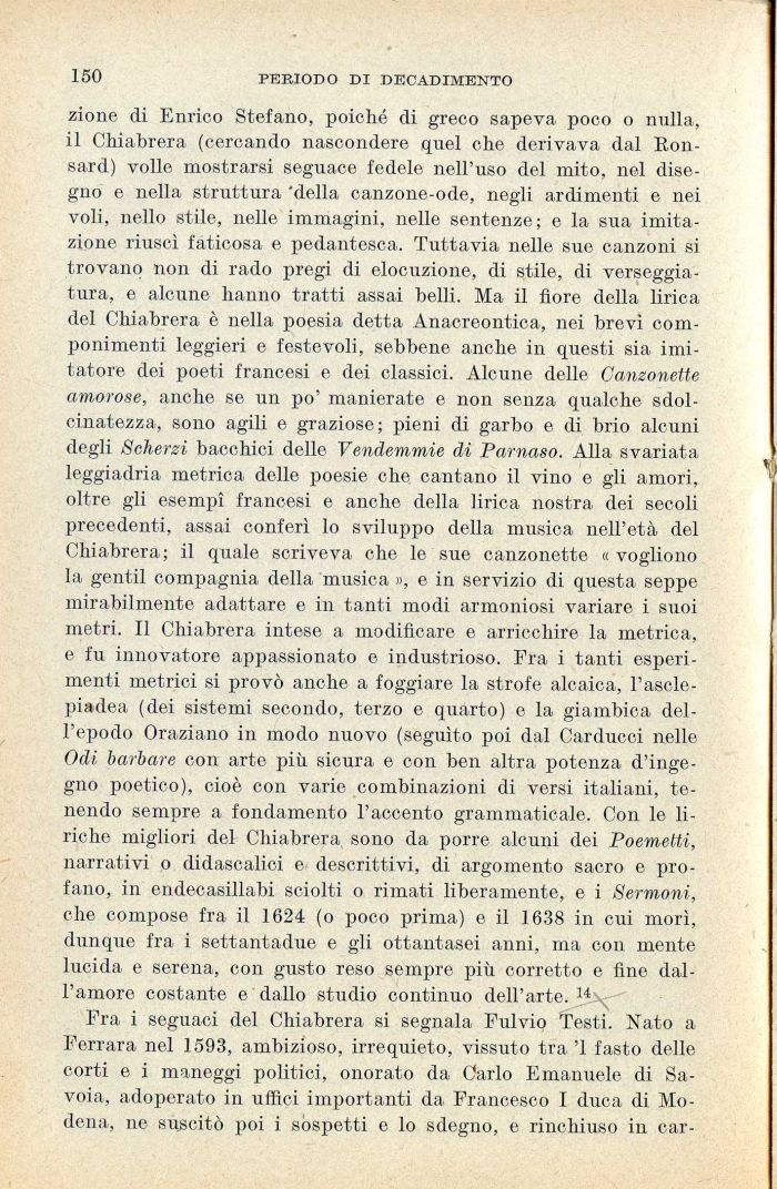 Fra i seguaci del Chiabrera si segnala Fulvio Testi. Nato a Ferrara nel 1593, ambizioso, irrequieto, vissuto tra '1 fasto delle corti e i maneggi politici, onorato da Carlo Emanuele di Savoia, adoperato in uffici importanti da Francesco I duca di Modena, ne suscitò poi i sospetti e lo sdegno, e rinchiuso in car-