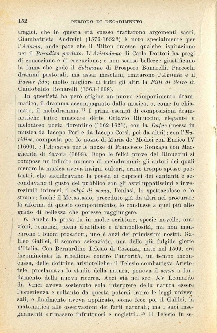 In quest'età ha però origine un nuovo componimento drammatico, il dramma accompagnato dalla musica, o, come fu chiamato, il melodramma.17 I primi esempi di composizioni drammatiche tutte musicate détte Ottavio Rinuccini, elegante e melodioso poeta fiorentino (1562-1621), con la Dafne (messa in musica da Iacopo Peri e da Iacopo Corsi, poi da altri) ; con l'Euridice, composta per le nozze di Maria de' Medici con Enrico IV (1600), e l'Arianna per le nozze di Francesco Gonzaga con Margherita di Savoia (1608). Dopo le felici prove del Rinuccini si compose un infinito numero di melodrammi; gli autori dei quali mentre la musica aveva insigni cultori, erano troppo spesso poetastri, che sacrificavano la poesia ai capricci dei cantanti e secondavano il gusto del pubblico con gli avviluppatissimi e inverosimili intrecci, i colpi di scena, l'enfasi, lo spettacoloso e lo strano ; finché il Metastasio, preceduto già da altri nel procurare la riforma di questo componimento, lo condusse a quel più alto grado di bellezza che potesse raggiungere.