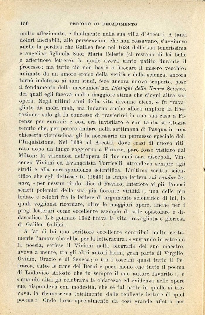 molto affezionato, e finalmente nella sua villa d'Arcetri. A tanti dolori ineffabili, alle persecuzioni che non cessavano, s'aggiunse anche la perdita che Galileo fece nel 1634 della sua tenerissima e angelica figliuola Suor Maria Celeste (ci restano di lei belle e affettuose lettere), la quale aveva tanto patito durante il processo; ma tutto ciò non bastò a fiaccare il misero vecchio: animato da un amore eroico della verità e della scienza, ancora tornò indefesso ai suoi studi, fece ancora nuove scoperte, pose il fondamento della meccanica nei Dialoghi delle Nuove Scienze, dei quali egli faceva molto maggiore stima che d'ogni altra sua opera. Negli ultimi anni della vita divenne cieco, e fu travagliato da molti mali, ma indarno anche allora implorò la liberazione: solo gli fu concesso di trasferirsi in una sua casa a Firenze per curarsi; e così era invigilato e con tanta strettezza tenuto ohe, per potere andare nella settimana di Pasqua in una chiesetta vicinissima, gli fu necessario un permesso speciale dell'Inquisizione. Nel 1638 ad Arcetri, dove erasi di nuovo ritirato dopo un lungo soggiorno a Firenze, pare fosse visitato dal Milton: là valendosi dell'opera di due suoi cari discepoli, Vincenzo Viviani ed Evangelista Torricelli, attendeva sempre agli studi e alla corrispondenza scientifica. L'ultimo scritto scientifico che egli dettasse fu (1640) la lunga lettera sul canclor lunare, « per nessun titolo, dice il Favaro, inferiore ai più famosi scritti polemici della sua più fiorente virilità » ; una delle più lodate e celebri fra le lettere di argomento scientifico di lui, le quali voglionsi ricordare, oltre le maggiori opere, anche per i pregi letterari come eccellente esempio di stile epistolare e didascalico. L'8 gennaio 1642 finiva la vita travagliata e gloriosa di Galileo Galilei.