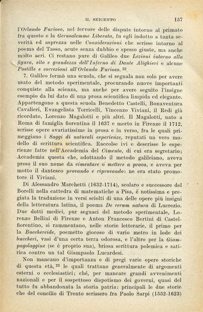 7. Galileo formò una scuola, che si segnala non solo per avere usato del metodo sperimentale, procurando nuove importanti conquiste alla scienza, ma anche per avere seguito l'insigne esempio da lui dato di una prosa scientifica limpida ed elegante. Appartengono a questa scuola Benedetto Castelli, Bonaventura Cavalieri, Evangelista Torricelli, Vincenzo Viviani, il Redi già ricordato, Lorenzo Magalotti e più altri. Il Magalotti, nato a Roma di famiglia fiorentina il 1637 e morto in Firenze il 1712, scrisse opere svariatissimo in prosa e in verso, fra le quali primeggiano i Saggi di naturali esperienze, reputati un vero modello di scrittura scientifica. Raccolse ivi e descrisse le esperienze fatte nell'Accademia del Cimento, di cui era segretario; Accademia questa che, adottando il metodo galileiano, aveva preso il suo nome da cimentare 6 mettere a prova, e aveva per motto il dantesco provando e riprovando: ne era stato promotore il Viviani.