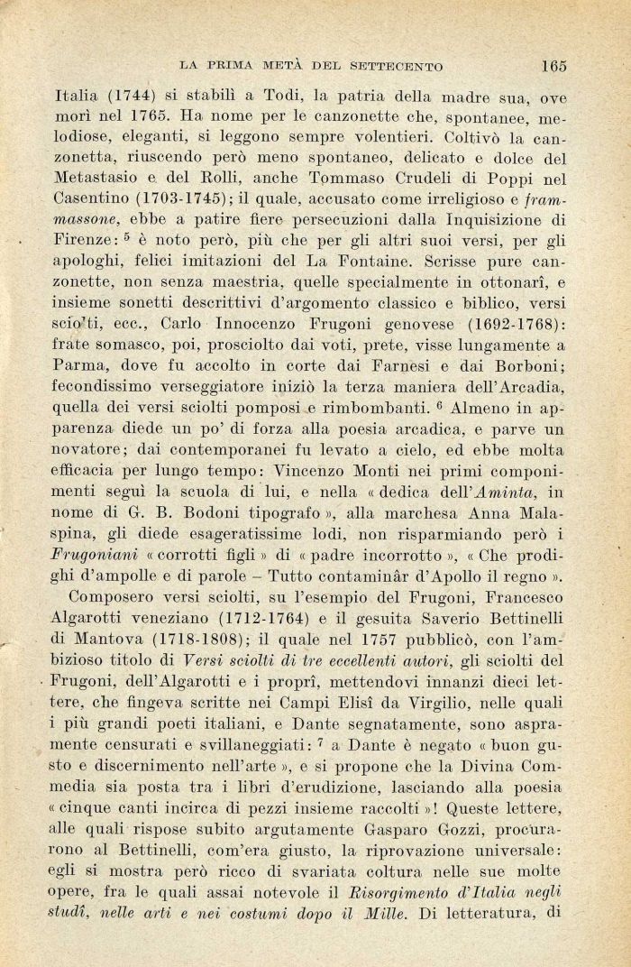 Composero versi sciolti, su l'esempio del Frugoni, Francesco Algarotti veneziano (1712-1764) e il gesuita Saverio Bettinelli di Mantova (1718-1808); il quale nel 1757 pubblicò, con l'ambizioso titolo di Versi sciolti di tre eccellenti autori, gli sciolti del Frugoni, dell'Algarotti e i propri, mettendovi innanzi dieci lettere, che fingeva scritte nei Campi Elisi da Virgilio, nelle quali i più grandi poeti italiani, e Dante segnatamente, sono aspramente censurati e svillaneggiati: 7 a Dante è negato « buon gusto e discernimento nell'arte », e si propone che la Divina Commedia sia posta tra i libri d'erudizione, lasciando alla poesia « cinque canti incirca di pezzi insieme raccolti » ! Queste lettere, alle quali rispose subito argutamente Gasparo Gozzi, procurarono al Bettinelli, com'era giusto, la riprovazione universale: egli si mostra però ricco di svariata coltura nelle sue molte opere, fra le quali assai notevole il Risorgimento d'Italia negli studi, nelle arti e nei costumi dopo il Mille. Di letteratura, di