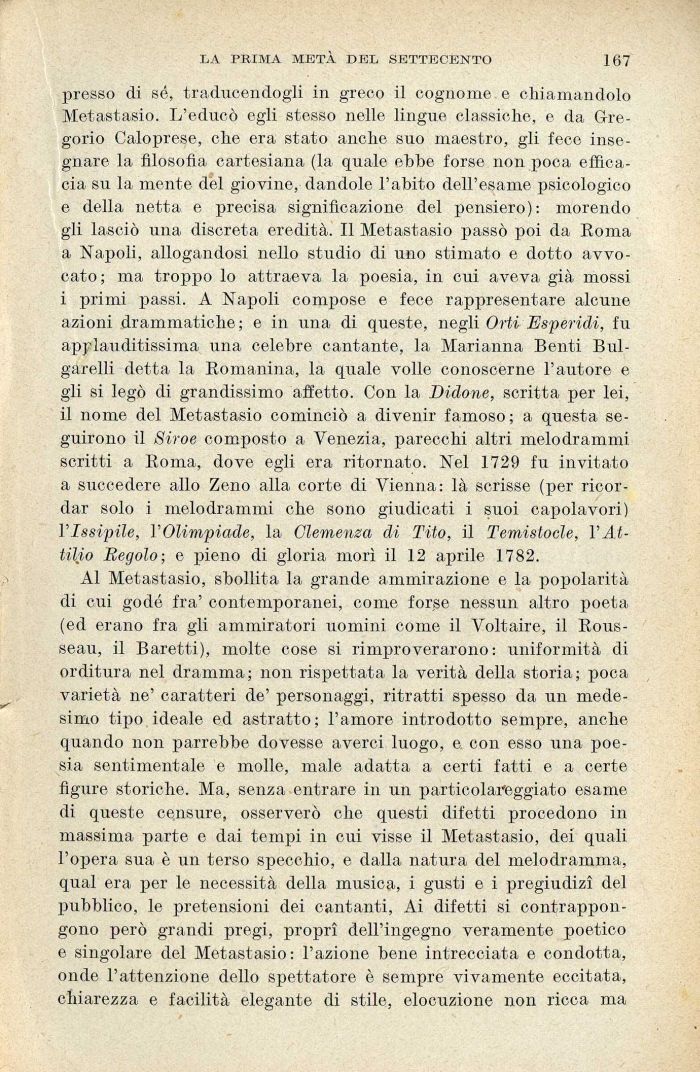 presso di sé, traducendogli in greco il cognome e chiamandolo Metastasio. L'educò egli stesso nelle lingue classiche, e da Gregorio Caloprese, che era stato anche suo maestro, gli fece insegnare la filosofia cartesiana (la quale ebbe forse non poca efficacia su la mente del giovine, dandole l'abito dell'esame psicologico e della netta e precisa significazione del pensiero): morendo gli lasciò una discreta eredità. Il Metastasio passò poi da Roma a Napoli, allogandosi nello studio di uno stimato e dotto avvocato ; ma troppo lo attraeva la poesia, in cui aveva già mossi i primi passi. A Napoli compose e fece rappresentare alcune azioni drammatiche; e in una di queste, negli Orti Esperidi, fu applauditissima una celebre cantante, la Marianna Benti Bui-garelli detta la Romanina, la quale volle conoscerne l'autore e gli si legò di grandissimo affetto. Con la Bidone, scritta per lei, il nome del Metastasio cominciò a divenir famoso; a questa seguirono il Siroe composto a Venezia, parecchi altri melodrammi scritti a Roma, dove egli era ritornato. Nel 1729 fu invitato a succedere allo Zeno alla corte di Vienna: là scrisse (per ricordar solo i melodrammi che sono giudicati i suoi capolavori) VIssipile, VOlimpiade, la Clemenza di Tito, il Temistocle, VAttilio Regolo; e pieno di gloria morì il 12 aprile 1782.