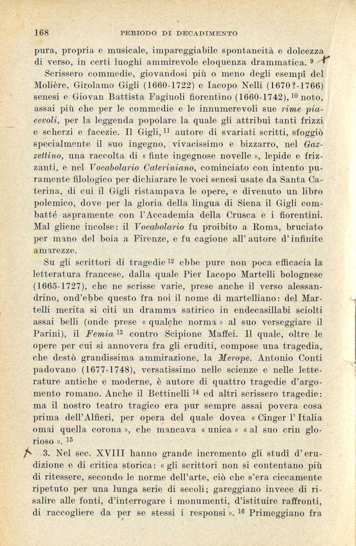 Scrissero commedie, giovandosi più o meno degli esempi del Molière, Girolamo Gigli (1660-1722) e Iacopo Nelli (16701-1766) senesi e Giovan Battista Fagiuoli fiorentino (1660-1742),10 noto, assai più che per le commedie e le innumerevoli sue rime piacevoli, per la leggenda popolare la quale gli attribuì tanti frizzi e scherzi e facezie. Il Gigli,11 autore di svariati scritti, sfoggiò specialmente il suo ingegno, vivacissimo e bizzarro, nel Gazzettino, una raccolta di « finte ingegnose novelle », lepide e frizzanti, e nel Vocabolario Gaterìniano, cominciato con intento puramente filologico per dichiarare le voci senesi usate da Santa Caterina, di cui il Gigli ristampava le opere, e divenuto un libro polemico, dove per la gloria della lingua di Siena il Gigli combatté aspramente con l'Accademia della Crusca e i fiorentini. Mal gliene incolse: il Vocabolario fu proibito a Roma, bruciato per mano del boia a Firenze, e fu cagione all' autore d'infinite amarezze.