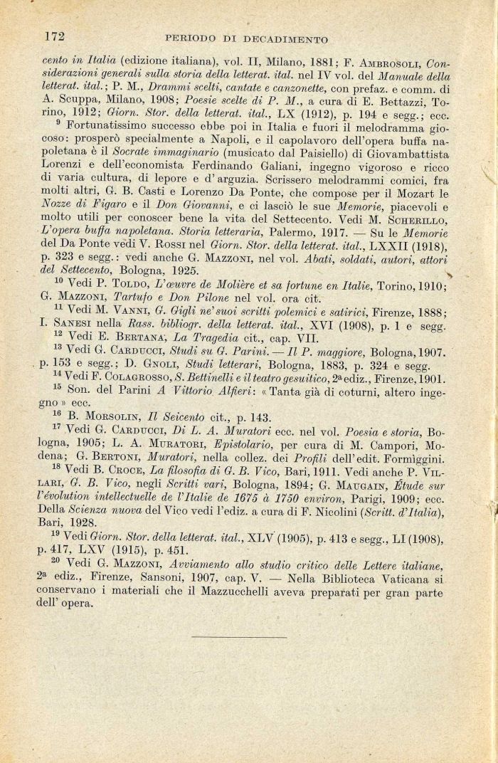 9 Fortunatissimo successo ebbe poi in Italia e fuori il melodramma giocoso: prosperò specialmente a Napoli, e il capolavoro dell'opera buffa napoletana è il Socrate immaginario (musicato dal Paisìello) di Giovambattista Lorenzi e dell'economista Ferdinando Galiani, ingegno vigoroso e ricco di varia cultura, di lepore e d'arguzia. Scrissero melodrammi comici, fra molti altri, G. B. Casti e Lorenzo Da Ponte, che compose per il Mozart le Nozze di Figaro e il Don Giovanni, e ci lasciò le sue Memorie, piacevoli e molto utili per conoscer bene la vita del Settecento. Vedi M. Scherillo, L'opera buffa napoletana. Storia letteraria, Palermo, 1917. — Su le Memorie del Da Ponte vedi V. Bossi nel Giorn. Stor. della letterat. ital., LXXII (1918), p. 323 e segg. : vedi anche G. Mazzoni, nel voi. Abati, soldati, autori, attori del Settecento, Bologna, 1925. >