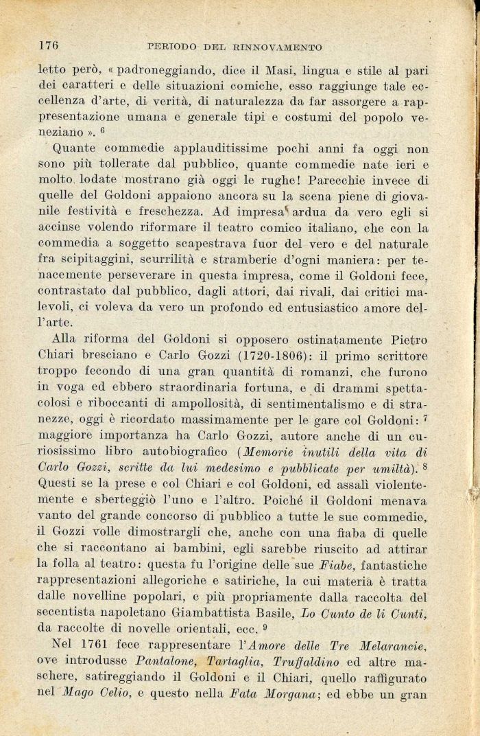 Alla riforma del Goldoni si opposero ostinatamente Pietro Chiari bresciano e Carlo Gozzi (1720-1806): il primo scrittore troppo fecondo di una gran quantità di romanzi, che furono in voga ed ebbero straordinaria fortuna, e di drammi spettacolosi e riboccanti di ampollosità, di sentimentalismo e di stranezze, oggi è ricordato massimamente per le gare col Goldoni: 7 maggiore importanza ha Carlo Gozzi, autore anche di un curiosissimo libro autobiografico (Memorie inutili della vita di Carlo Gozzi, scritte da lui medesimo e pubblicate per umiltà). 8 Questi se la prese e col Chiari e col Goldoni, ed assalì violentemente e sberteggiò l'uno e l'altro. Poiché il Goldoni menava vanto del grande concorso di pubblico a tutte le sue commedie, il Gozzi volle dimostrargli che, anche con una fiaba di quelle che si raccontano ai bambini, egli sarebbe riuscito ad attirar la folla al teatro: questa fu l'origine delle sue Fiabe, fantastiche rappresentazioni allegoriche e satiriche, la cui materia è tratta dalle novelline popolari, e più propriamente dalla raccolta del secentista napoletano Giambattista Basile, Lo Cunto de li Cunti, da raccolte di novelle orientali, ecc. 9