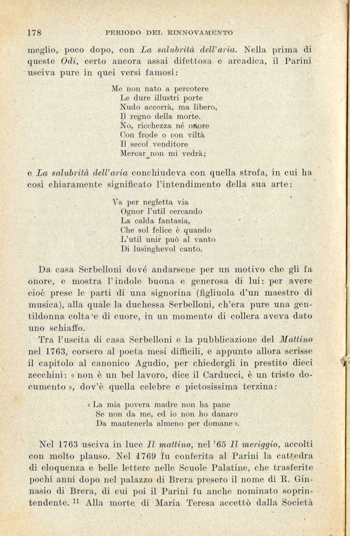 meglio, poco dopo, con La salubrità dell'aria. Nella prima di queste Odi, certo ancora assai difettosa e arcadica, il Parini usciva pure in quei versi famosi: