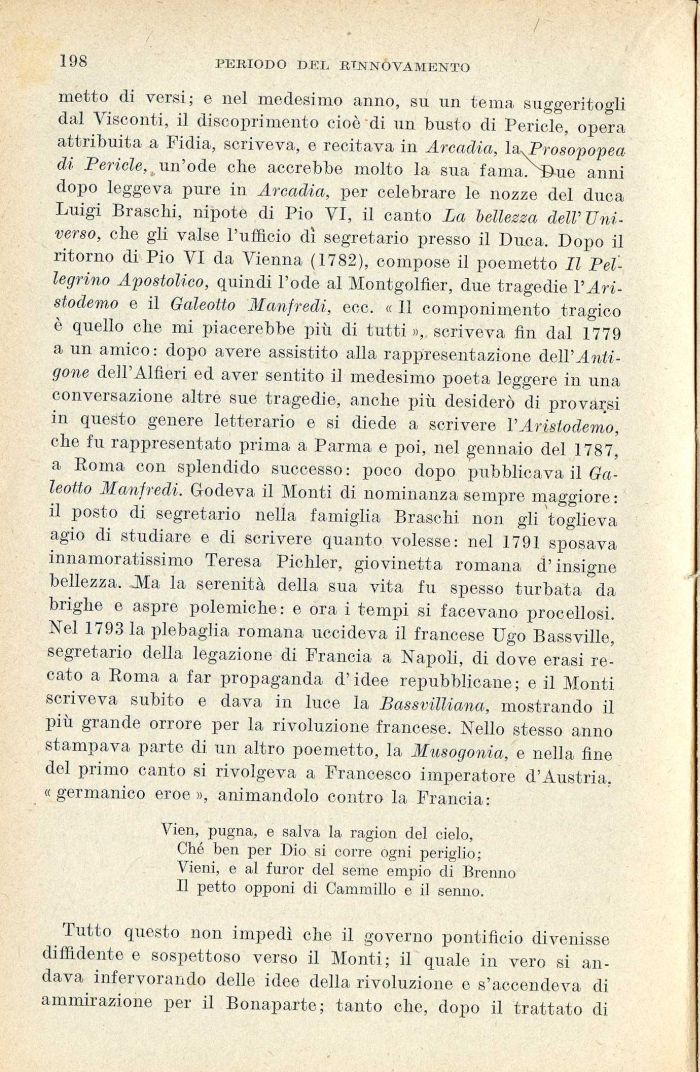 metto di versi; e nel medesimo anno, su un tema suggeritogli dal Visconti, il discoprimento cioc di un busto di Pericle, opera attribuita a Fidia, scriveva, e recitava in Arcadia, la^Prosopopea di Pericle, un'ode che accrebbe molto la sua fama. T^-ue anni dopo leggeva pure in Arcadia, per celebrare le nozze del duca Luigi Brasclii, nipote di Pio VI, il canto La bellezza dell'Universo, che gli valse l'ufficio di segretario presso il Duca. Dopo il ritorno di Pio VI da Vienna (1782), compose il poemetto II Pellegrino Apostolico, quindi l'ode al Montgolfler, due tragedie l'Aristodemo e il Galeotto Manfredi, ecc. « 11 componimento tragico è quello che mi piacerebbe più di tutti », scriveva fin dal 1779 a un amico : dopo avere assistito alla rappresentazione dell' Antigone dell'Alfieri ed aver sentito il medesimo poeta leggere in una conversazione altre sue tragedie, anche più desiderò di provarsi in questo genere letterario e si diede a scrivere l'Aristodemo, che fu rappresentato prima a Parma e poi, nel gennaio del 1787, a Roma con splendido successo: poco dopo pubblicava il Galeotto Manfredi. Godeva il Monti di nominanza sempre maggiore: il posto di segretario nella famiglia Brasc.hi non gli toglieva agio di studiare e di scrivere quanto volesse: nel 1791 sposava innamoratissimo Teresa Pichler, giovinetta romana d'insigne bellezza. Mia la serenità della sua vita fu spesso turbata da brighe e aspre polemiche: e ora i tempi si facevano procellosi. Nel 1793 la plebaglia romana uccideva il francese Ugo Bassville, segretario della legazione di Francia a Napoli, di dove erasi recato a Roma a far propaganda d'idee repubblicane; e il Monti scriveva subito e dava in luce la Bassvilliana, mostrando il più grande orrore per la rivoluzione francese. Nello stesso anno stampava parte di un altro poemetto, la Musogonia, e nella fine del primo canto si rivolgeva a Francesco imperatore d'Austria, «germanico eroe», animandolo contro la Francia: