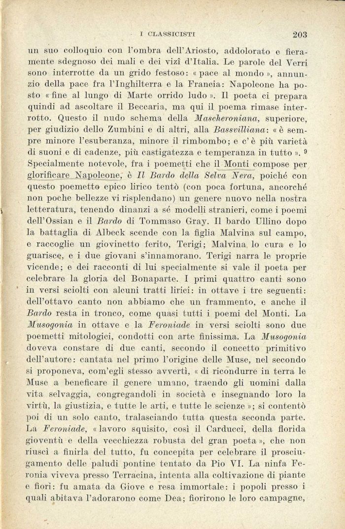 un suo colloquio con l'ombra dell'Ariosto, addolorato e fieramente sdegnoso dei mali e dei vizi d'Italia. Le parole del Verri sono interrotte da un grido festoso: « pace al mondo», annunzio della pace fra l'Inghilterra e la Francia: Napoleone ha posto « fine al lungo di Marte orrido ludo ». Il poeta ci prepara quindi ad ascoltare il Beccaria, ma qui il poema rimase interrotto. Questo il nudo schema della Mascheroniana, superiore, per giudizio dello Zumbini e di altri, alla Bassvilliana: «è sempre minore l'esuberanza, minore il rimbombo; e c'è più varietà di suoni e di cadenze, più castigatezza e temperanza in tutto ». 9 Specialmente notevole, fra i poemetti che il Monti compose per glorificare Napoleone, è II Bardo della Selva Nera, poiché con questo poemetto epico lirico tentò (con poca fortuna, ancorché non poche bellezze vi risplendano) un genere nuovo nella nostra i letteratura, tenendo dinanzi a sé modelli stranieri, come i poemi dell'Ossian e il Bardo di Tommaso Gray. Il bardo Ullino dopo la battaglia di Albeck scende con la figlia Malvina sul campo, e raccoglie un giovinetto ferito, Terigi; Malvina lo cura e lo guarisce, e i due giovani s'innamorano. Terigi narra le proprie vicende; e dei racconti di lui specialmente si vale il poeta per celebrare la gloria del Bonaparte. I primi quattro canti sono in versi sciolti con alcuni tratti lirici: in ottave i tre seguenti: dell'ottavo canto non abbiamo che un frammento, e anche il Bardo resta in tronco, come quasi tutti i poemi del Monti. La Musogonia in ottave e la Feroniade in versi sciolti sono due poemetti mitologici, condotti con arte finissima. La Musogonia doveva constare di due canti, secondo il concetto primitivo dell'autore: cantata nel primo l'origine delle Muse, nel secondo si proponeva, com'egli stesso avvertì, « di ricondurre in terra le Muse a beneficare il genere umano, traendo gli uomini dalla vita selvaggia, congregandoli in società e insegnando loro la virtù, la giustizia, e tutte le arti, e tutte le scienze »; si contentò poi di un solo canto, tralasciando tutta questa seconda parte. La Feroniade, « lavoro squisito, così il Carducci, della florida gioventù e della vecchiezza robusta del gran poeta », che non riuscì a finirla del tutto, fu concepita per celebrare il prosciugamento delle paludi pontine tentato da Pio VI. La ninfa Fe-ronia viveva presso Terràcina, intenta alla coltivazione di piante e fiori: fu amata da Giove e resa immortale: i popoli presso i quali abitava l'adorarono come Dea; fiorirono le loro campagne,