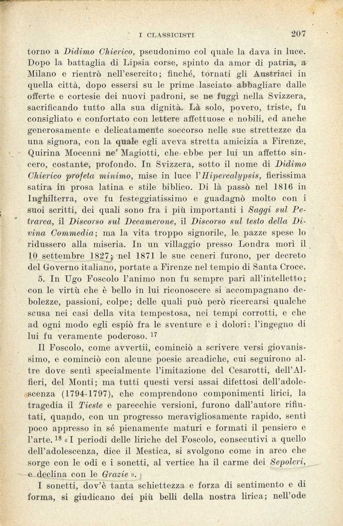 5. In Ugo Foscolo l'animo non fu sempre pari all'intelletto ; con le virtù che è bello in lui riconoscere si 'accompagnano debolezze, passioni, colpe; delle quali può però ricercarsi qualche scusa nei casi della vita tempestosa, nei tempi corrotti, e che ad ogni modo egli espiò fra le sventure e i dolori: l'ingegno di lui fu veramente poderoso. 17