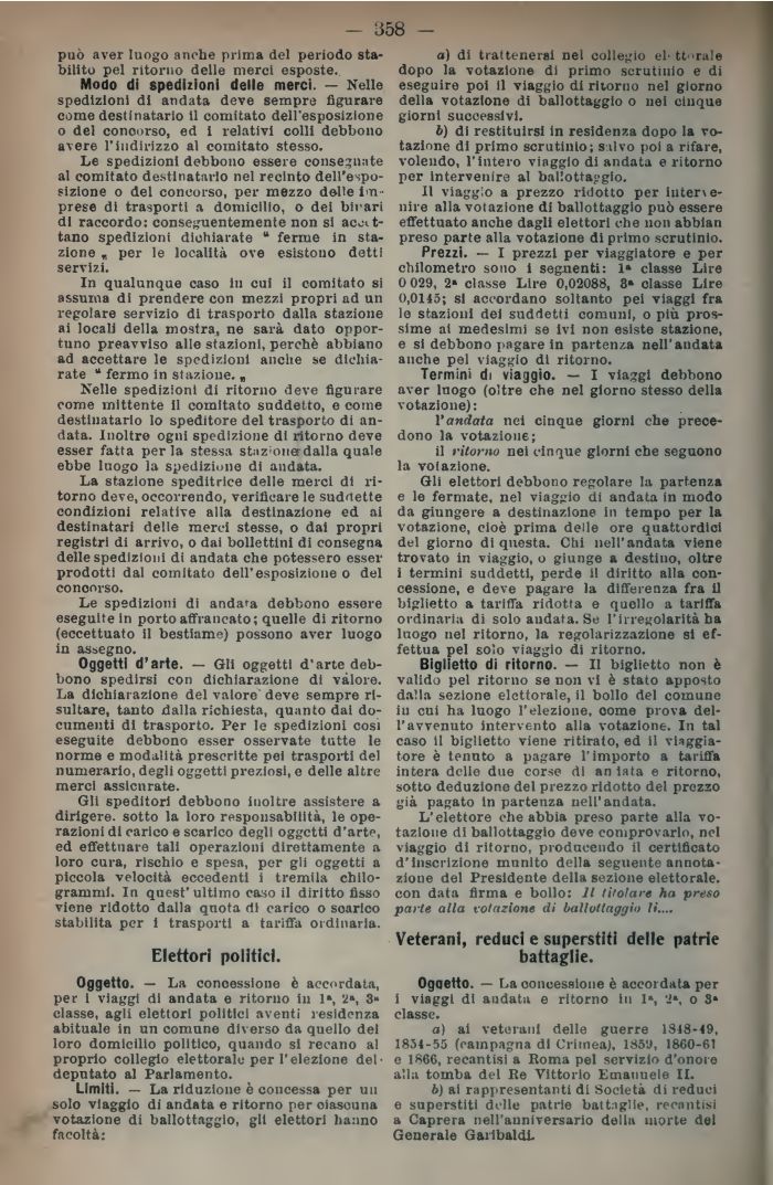 Oggetto. — La concessione è accordata, per i viaggi di andata e ritorno ili 1», 2», 3» classe, agli elettori politici aventi residenza abituale in un comune diverso da quello del loro domicilio politico, quando si recano al proprio collegio elettorale per l'elezione del-deputato al Parlamento.