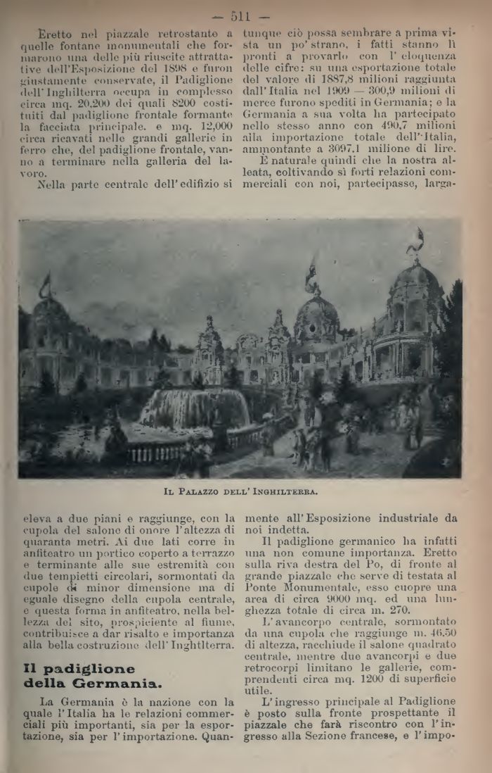 Eretto nel piazzalo retrostante a quelle fontane monumentali che formarono una delle più riuscite attratta-tive dell'Esposizione del 1898 e furon giustamente conservate, il Padiglione dall'Inghilterra occupa in complesso circa inq. 20/200 dei quali 8200 costituiti dal padiglione frontale formante la facciata principale, e mq. 12,000 circa ricavati nelle grandi gallerie in ferro che, del padiglione frontale, vanno a terminare nella galleria del lavoro.