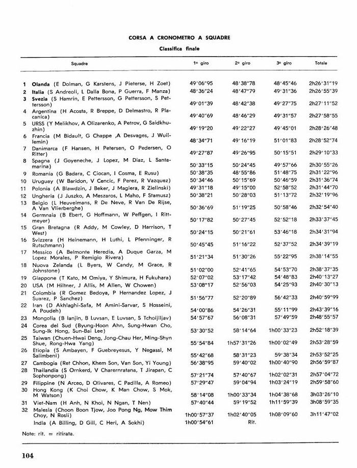19 Giappone (T Kato, M Omiya, Y Shimura, H Fukuhara) 52'07"02 53'17"42 54'48"83 2h40'13"27