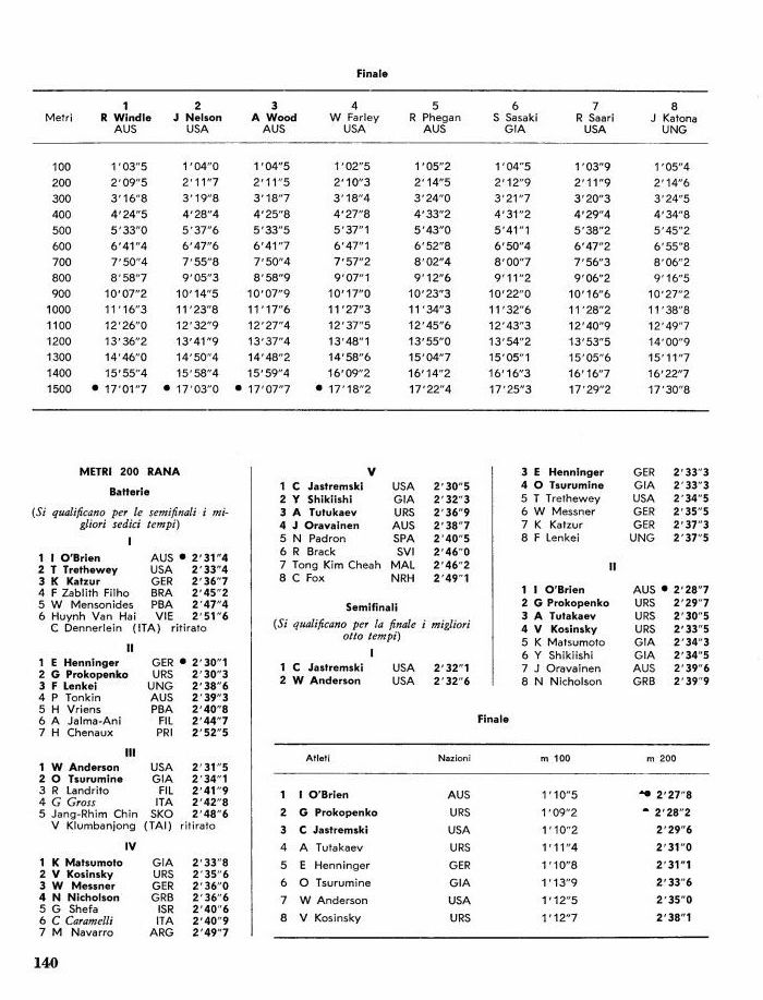 1 1 O'Brien AUS • 2 '31 "4 2 T Trethewey USA 2'33"4 3 K Katzur GER 2'36"7 4 F Zablith Filho BRA 2'45"2 5 W Mensonides PBA 2'47"4 6 Huynh Van Hai VIE 2'51"6 C Dennerlein (ITA) ritirato II 1 E Henninger GER • 2'30"1 2 G Prokopenko URS 2'30"3 3 F Lenkei UNG 2' 38" 6 6 R Brack SVI 2'46"0 7 Tong Kim Cheah MAL 2'46"2 8 C Fox NRH 2 '49"1 Semifinali (Si qualificano per la finale i migliori otto tempi) \ 1 C Jastremski USA 2'32"1 2 W Anderson USA 2'32"6 II 1 1 O'Brien 2 G Prokopenko 3 A Tutakaev 4 V Kosinsky 5 K Matsumoto 6 Y Shikiishi 7 J Oravainen 8 N Nicholson AUS • 2'28"7 URS 2'29"7 URS 2'30"5 URS 2'33"5 GIÀ 2'34"3 GIÀ 2'34"5 AUS 2'39"6 GRB 2'39"9