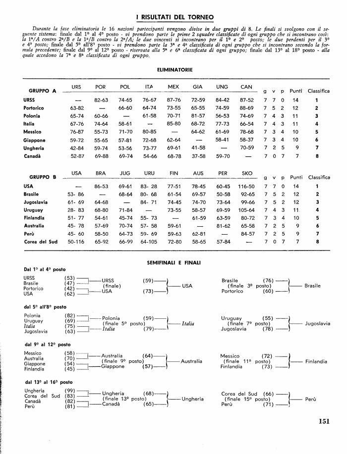 Dal 1° al 4° URSS Brasile Portorico USA dal 5° all'8° Polonia Uruguay Italia Jugoslavia dal 9° al 1 Messico Australia Giappone Finlandia dal 13° al ' Ungheria Corea del Canada posto SEMIFINALI E FINALI USA Italia Australia Ungheria Brasile (finale 3° Portorico Uruguay (finale 7° Jugoslavia Messico (finale 11° Finlandia Corea del Su (finale 15° Pon'i (7M Brasile Jugoslavia Finlandia Perù