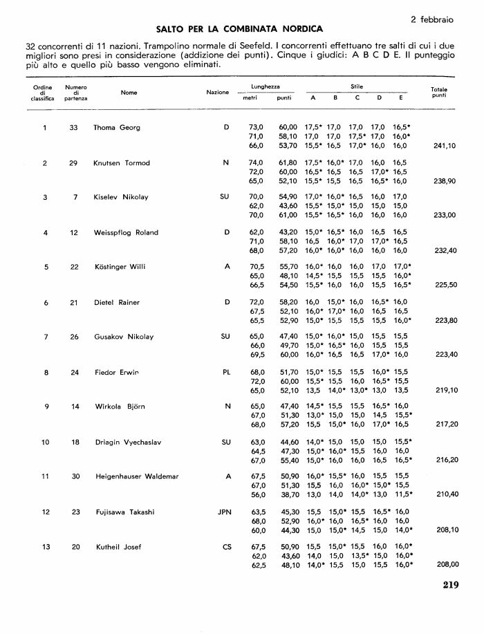32 concorrenti di 11 nazioni. Trampolino normale di Seefeld. I concorrenti effettuano tre salti di cui i due migliori sono presi in considerazione (addizione dei punti). Cinque i giudici: A B C D E. Il punteggio più alto e quello più basso vengono eliminati.