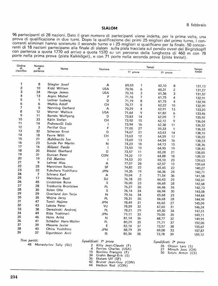 96 partecipanti di 28 nazioni. Dato il gran numero di partecipanti viene indetta, per la prima volta, una prova di qualificazione in due turni. Dopo la qualificazione dei primi 25 migliori del primo turno, i concorrenti eliminati hanno sostenuto il secondo turno e i 25 migliori si qualificano per la finale. 50 concorrenti di 18 nazioni partecipano alla finale di slalom sulla pista tracciata sul pendio ovest del Birgitzkopfl con partenza a quota 1770 ed arrivo a quota 1570 su un percorso della lunghezza di 460 m con 78 porte nella prima prova (pista Kalkkogel), e con 71 porte nella seconda prova (pista Inntal).