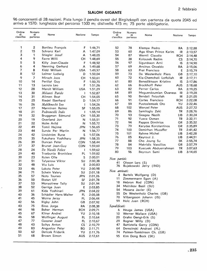 5 5 Killy Jean-Claude F 1 :48,92 56 97 Sigurdsson Arni IS 2:14,90