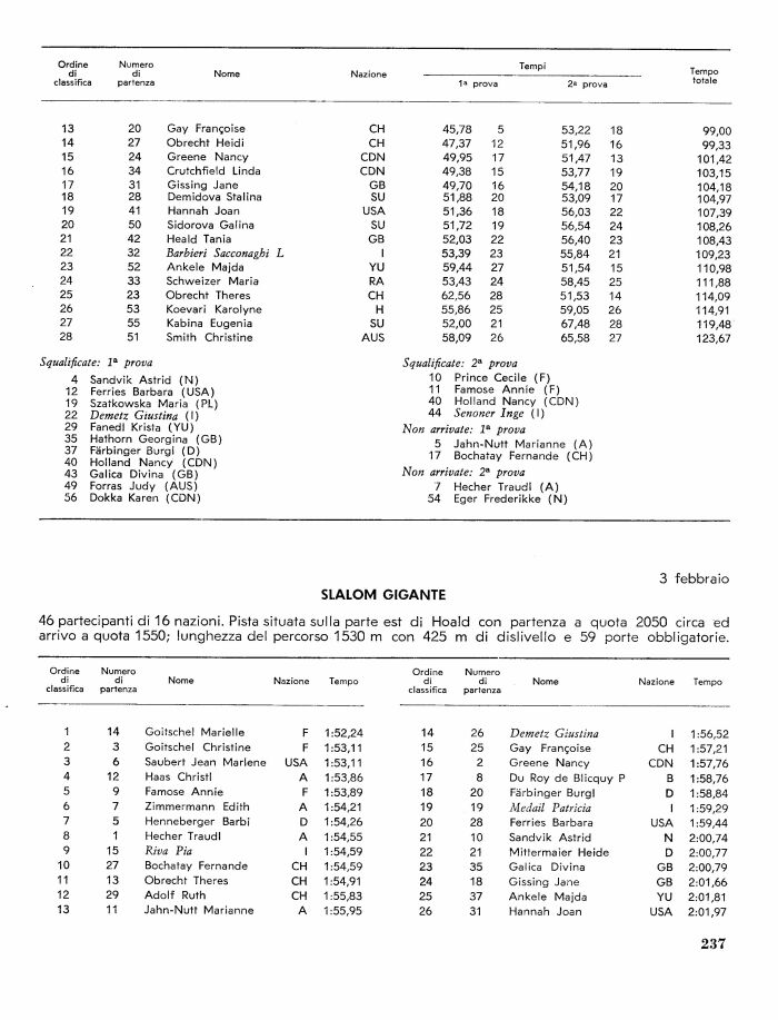 12 19 22	Ferries Barbara   (USA) Szatkowska Maria   (PL) Demetz Giustina (I)		11 40 44	Famose  Annie   (F) Holland Nancy  (CON) Senoner Inge ( I )