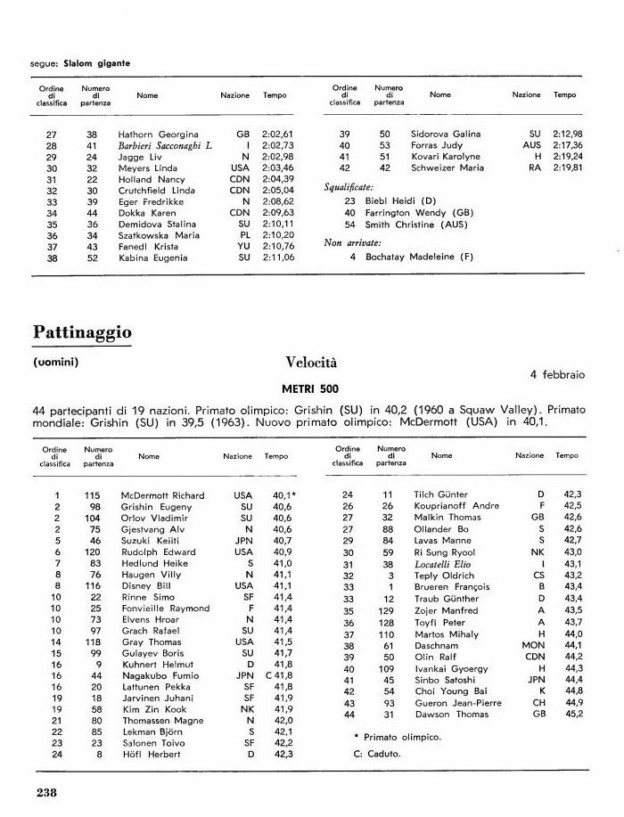 (uomini) Velocità 4 febbraio METRI 500 44 partecipanti di 19 nazioni. Primato olimpico: Grishin (SU) in 40,2 (1960 a Squaw Valley). Primato mondiale: Grishin (SU) in 39,5 (1963). Nuovo primato olimpico: McDermott (USA) in 40,1.