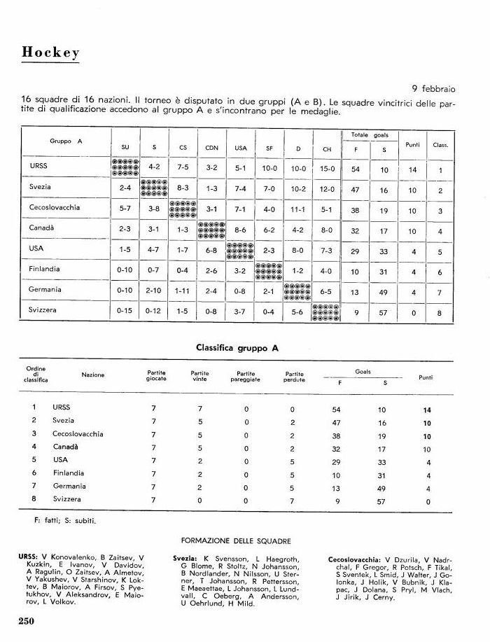 Cecoslovacchia: V Dzurila, V Nadr-chal, F Gregor, R Potsch, F Tikal, S Sventek, L Smid, J Walter, J Go-lonka, J Holik, V Bubnik, J Kla-pac, J Dolana, S Pryl, M Vlach, J Jirik, J Cerny.