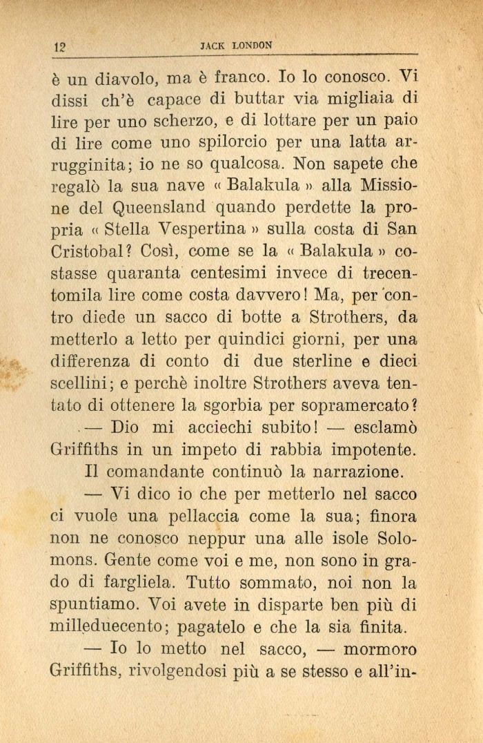 — Vi dico io che per metterlo nel sacco ci vuole una pellaccia come la sua; finora non ne conosco neppur una alle isole Solo-mons. Gente come voi e me, non sono in grado di fargliela. Tutto sommato, noi non la spuntiamo. Voi avete in disparte ben più di milleduecento; pagatelo e che la sia finita.