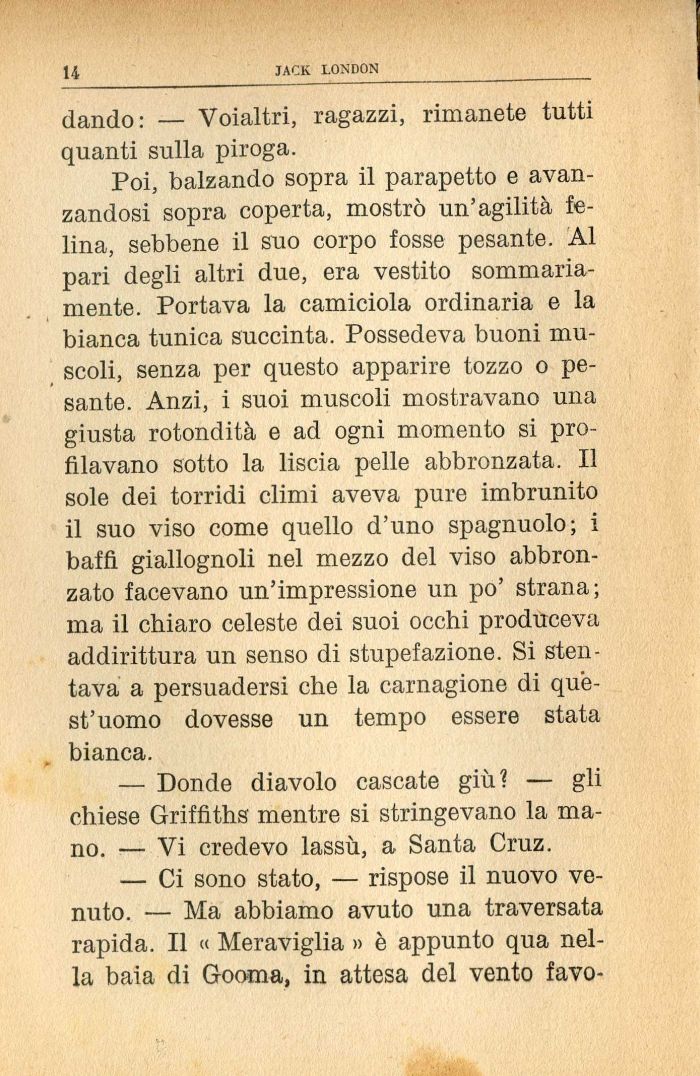 Poi, balzando sopra il parapetto e avanzandosi sopra coperta, mostrò un'agilità felina, sebbene il suo corpo fosse pesante. Al pari degli altri due, era vestito sommariamente. Portava la camiciola ordinaria e la bianca tunica succinta. Possedeva buoni muscoli, senza per questo apparire tozzo o pesante. Anzi, i suoi muscoli mostravano una giusta rotondità e ad ogni momento si profilavano sotto la liscia pelle abbronzata. Il sole dei torridi climi aveva pure imbrunito il suo viso come quello d'uno spagnuolo; i baffi giallognoli nel mezzo del viso abbronzato facevano un'impressione un po' strana; ma il chiaro celeste dei suoi occhi produceva addirittura un senso di stupefazione. Si stentava a persuadersi che la carnagione di quest'uomo dovesse un tempo essere stata bianca.