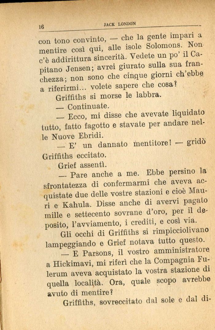 con tono convinto, — che la gente impari a mentire così qui, alle isole Solomons. Non c'è addirittura sincerità. Vedete un po' il Capitano Jensen; avrei giurato sulla sua franchezza; non sono che cinque giorni ch'ebbe a riferirmi... volete sapere che cosa?