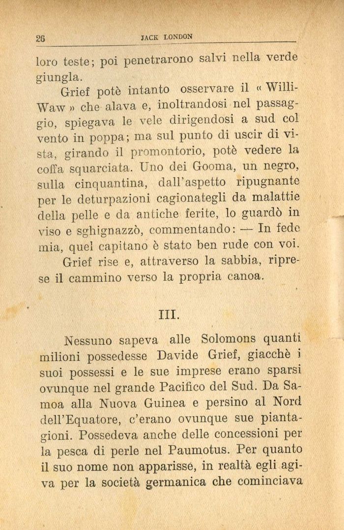 Nessuno sapeva alle Solomons quanti milioni possedesse Davide Grief, giacché i suoi possessi e le sue imprese erano sparsi ovunque nel grande Pacifico del Sud. Da Samoa alla Nuova Guinea e persino al Nord dell'Equatore, c'erano ovunque sue piantagioni. Possedeva anche delle concessioni perla pesca di perle nel Paumotus. Per quanto il suo nome non apparisse, in realtà egli agiva per la società germanica che cominciava