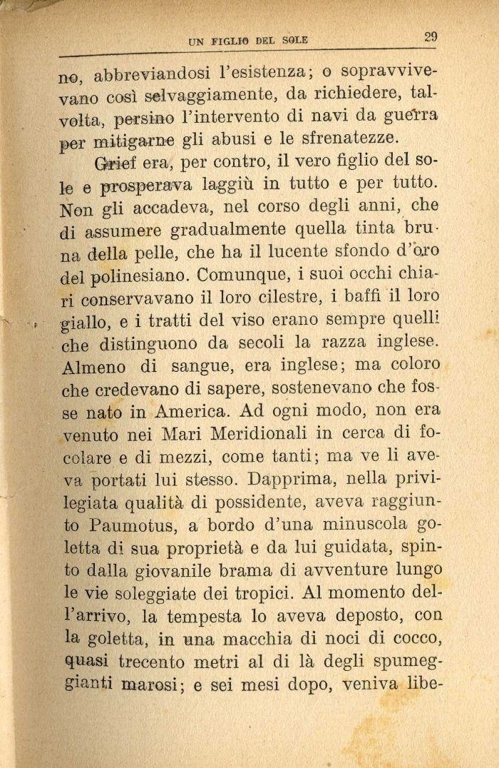 Grief era, per contro, il vero figlio del sole e prosperava laggiù in tutto e per tutto. Non gli accadeva, nel corso degli anni, che di assumere gradualmente quella tinta bruna della pelle, che ha il lucente sfondo d'oro del polinesiano. Comunque, i suoi occhi chiari conservavano il loro cilestre, i baffi il loro giallo, e i tratti del viso erano sempre quelli che distinguono da secoli la razza inglese. Almeno di sangue, era inglese; ma coloro che credevano di sapere, sostenevano che fosse nato in America. Ad ogni modo, non era venuto nei Mari Meridionali in cerca di focolare e eli mezzi, come tanti; ma ve li aveva portati lui stesso. Dapprima, nella privilegiata qualità di possidente, aveva raggiunto Paumotus, a bordo d'una minuscola goletta di sua proprietà e da lui guidata, spinto dalla giovanile brama di avventure lungo le vie soleggiate dei tropici. Al momento dell'arrivo, la tempesta lo aveva deposto, con la goletta, in una macchia di noci di cocco, quasi trecento metri al di là degli spumeggianti marosi; e sei mesi dopo, veniva libe-