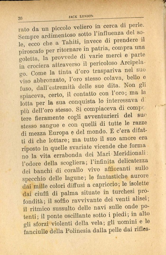 rato da un piccolo veliero in cerca di perle. Sempre ardimentoso sotto l'influenza del sole, ecco che a Tahiti, invece di prendere il piroscafo per ritornare in patria, compra una goletta, la provvede di varie merci e parte in crociera attraverso il pericoloso Arcipelago. Come la tinta d'oro traspariva nel suo viso abbronzato, l'oro stesso colava, bello e fuso, dall'estremità delle sue dita. Non gli spiaceva, certo, il contatto con l'oro; ma la lotta per la sua conquista lo interessava d più dell'oro stesso. Si compiaceva di compc tere fieramente cogli avventurieri del sue stesso sangue e con quelli di tutte le razze di mezza Europa e del mondo. E c'era difatti di che lottare; ma tutto il suo amore era riposto in quelle svariate vicende che forma no la vita errabonda dei Mari Meridionali : l'odore della scogliera; l'infinita delicatezza dei banchi eli corallo vivo affioranti sullo specchio delle lagune; le fantastiche aurore dai mille colori diffusi a capriccio; le isolette dai ciuffi di palma situate in turchesi profondità; il soffio ravvivante dei venti alisei; il ritmico sussulto delle navi sulle onde potenti; il ponte oscillante sotto i piedi; in alto gli sforzi violenti della vela; gli uomini e le fanciulle della Polinesia dalla pelle dai rifles-