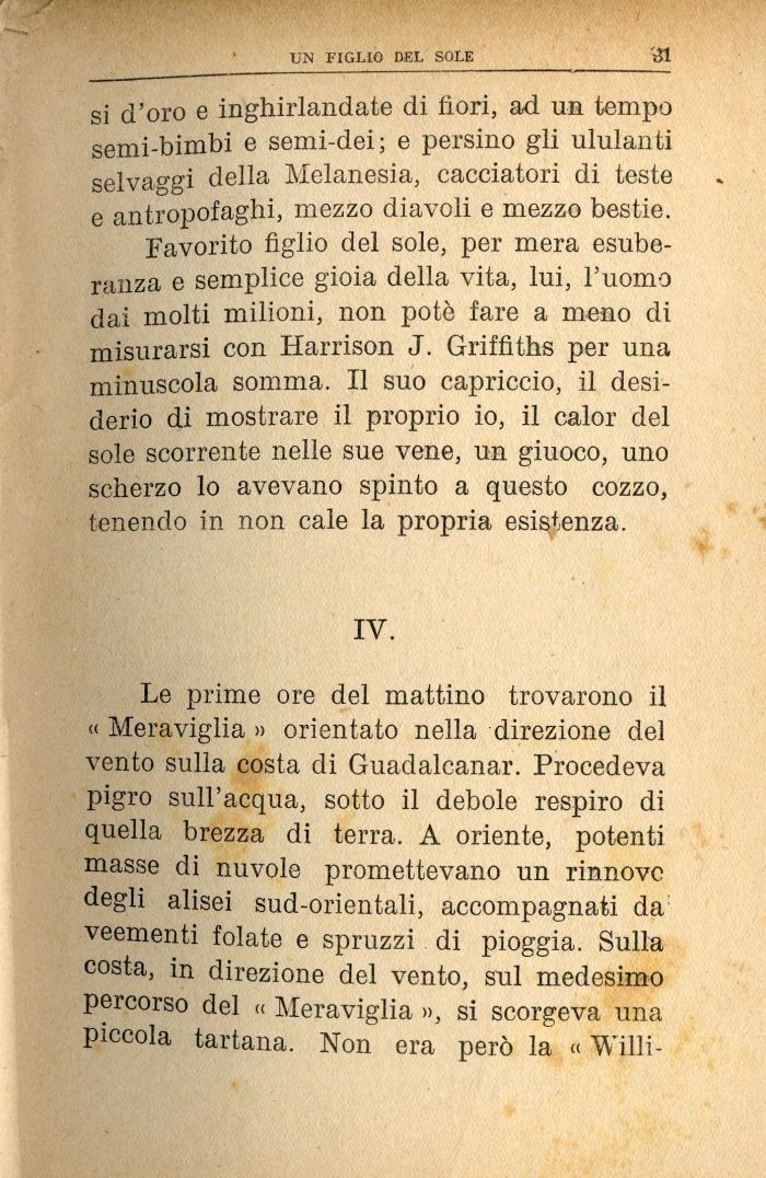 Favorito figlio del sole, per mera esuberanza e semplice gioia della vita, lui, l'uomo dai molti milioni, non potè fare a meno di misurarsi con Harrison J. Griffiths per una minuscola somma. Il suo capriccio, il desiderio di mostrare il proprio io, il calor del sole scorrente nelle sue vene, un giuoco, uno scherzo lo avevano spinto a questo cozzo, tenendo in non cale la propria esistenza.