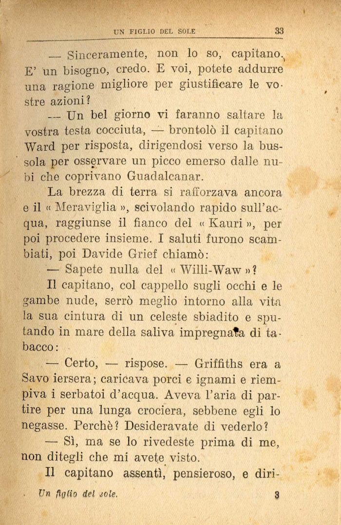 — Certo, — rispose. — Griffiths era a Savo iersera; caricava porci e ignami e riempiva i serbatoi d'acqua. Aveva l'aria di partire per una lunga crociera, sebbene egli lo negasse. Perchè? Desideravate di vederlo?