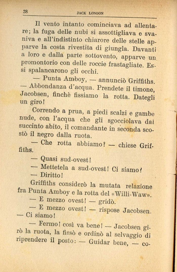 — Fermo ! così va bene ! — Jacobsen girò la ruota, la fissò e ordinò al selvaggio di riprendere il posto: — Guidar bene, — co-