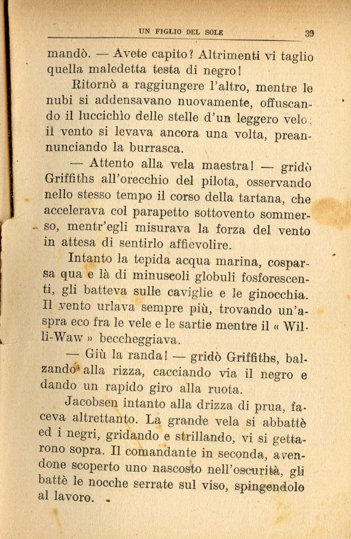 Intanto la tepida acqua marina, cosparsa qua e là di minuscoli globuli fosforescenti, gli batteva sulle caviglie e le ginocchia. Il vento urlava sempre più, trovando un'aspra eco fra le vele e le sartie mentre il « Wil-li-Waw » beccheggiava.