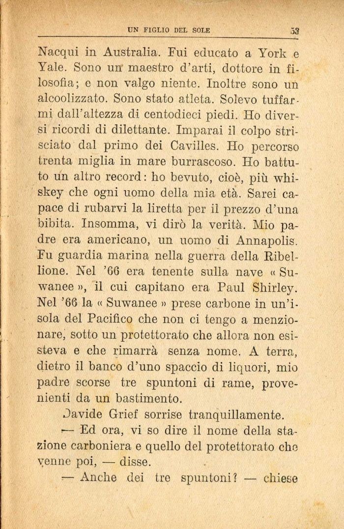 Nacqui in Australia. Fui educato a York e Yale. Sono un maestro d'arti, dottore in filosofia; e non valgo niente. Inoltre sono un alcoolizzato. Sono stato atleta. Solevo tuffarmi dall'altezza di centodieci piedi. Ho diversi ricordi di dilettante. Imparai il colpo strisciato dal primo dei Caviìles. Ho percorso trenta miglia in mare burrascoso. Ho battuto un altro record : ho bevuto, cioè, più whi-skey che ogni uomo della mia età. Sarei capace di rubarvi la liretta per il prezzo d'una bibita. Insomma, vi dirò la verità. Mio padre era americano, un uomo di Annapolis. Fu guardia marina nella guerra della Ribellione. Nel 'G6 era tenente sulla nave « Su-wanee », il cui capitano era Paul Shirley. Nel '68 la « Suwanee » prese carbone in un'isola del Pacifico che non ci tengo a menzionare, sotto un protettorato che allora non esisteva e che rimarrà senza nome. A terra, dietro il banco d'uno spaccio di liquori, mio padre scorse tre spuntoni di rame, provenienti da un bastimento.