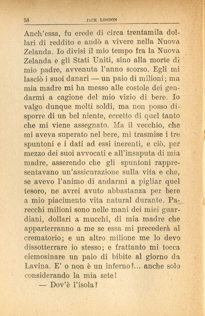 Anch'essa, fu erede di circa trentamila dollari di reddito e andò a vivere nella Nuova Zelanda. Io divisi il mio tempo fra la Nuova Zelanda e gli Stati Uniti, sino alla morte di mio padre, avvenuta l'anno scorso. Egli mi lasciò i suoi danari — un paio di milioni ; ma mia madre mi ha messo alle costole dei gendarmi a cagione del mio vizio di bere. Io valgo dunque molti soldi, ma non posso disporre di un bel niente, eccetto di quel tanto che mi viene assegnato. Ma il vecchio, che mi aveva superato nel bere, mi trasmise i tre spuntoni e i dati ad essi inerenti, e ciò, per mezzo dei suoi avvocati e all'insaputa di mia madre, asserendo che gli spuntoni rappresentavano un'assicurazione sulla vita e che, se avevo l'animo di andarmi a pigliar quel tesoro, ne avrei avuto abbastanza per bere a mio piacimento vita naturai durante. Parecchi milioni sono nelle mani dei miei guardiani, dollari a mucchi, di mia madre che apparterranno a me se essa mi precederà al crematorio; e un altro milione me lo devo dissotterrare io stesso; e frattanto mi tocca elemosinare un paio di bibite al giorno da Lavina. E' o non è un inferno?... anche solo considerando la mia sete!