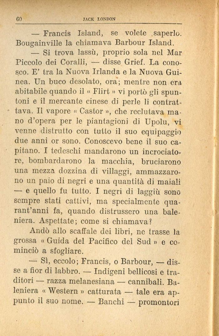 Piccolo dei Coralli, — disse Grief. La conosco. E' tra la Nuova Irlanda e la Nuova Guinea. Un buco desolato, ora; mentre non era abitabile quando il « Flirt » vi portò gli spuntoni e il mercante cinese di perle li contrattava. Il vapore « Castor », che reclutava mano d'opera per le piantagioni di Upolu, vi venne distrutto con tutto il suo equipaggio due anni or sono. Conoscevo bene il suo capitano. I tedeschi mandarono un incrociatore, bombardarono la macchia, bruciarono una mezza dozzina di villaggi, ammazzarono un paio di negri e una quantità di maiali — e quello fu tutto. I negri di laggiù sono sempre stati cattivi, ma specialmente qua-rant'anni fa, quando distrussero una baleniera. Aspettate; come si chiamava?