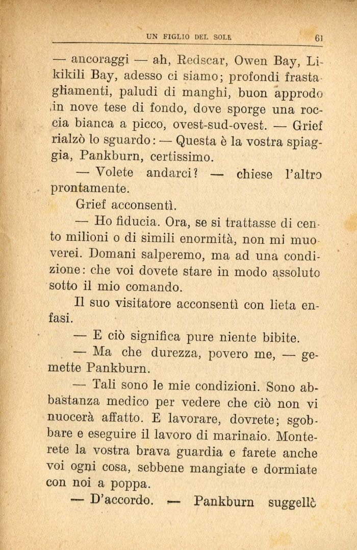— Ho fiducia. Ora, se si trattasse di cento milioni o di simili enormità, non mi muo verei. Domani salperemo, ma ad una condizione: che voi dovete stare in modo assoluto sotto il mio comando.