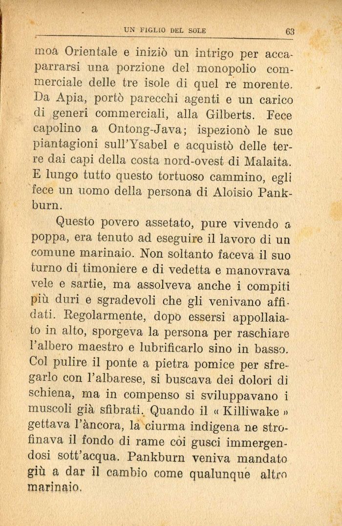 Questo povero assetato, pure vivendo a poppa, era tenuto ad eseguire il lavoro di un comune marinaio. Non soltanto faceva il suo turno di timoniere e di vedetta e manovrava vele e sartie, ma assolveva anche i compiti più duri e sgradevoli che gli venivano affidati. Regolarmente, dopo essersi appollaiato in alto, sporgeva la persona per raschiare l'albero maestro e lubrificarlo sino in basso. Col pulire il ponte a pietra pomice per sfregarlo con l'albarese, si buscava dei dolori di schiena, ma in compenso si sviluppavano i muscoli già sfibrati. Quando il « Killiwake » gettava l'àncora, la ciurma indigena ne strofinava il fondo di rame coi gusci immergendosi sott'acqua. Pankburn veniva mandato giù a dar il cambio come qualunque altro marinaio.