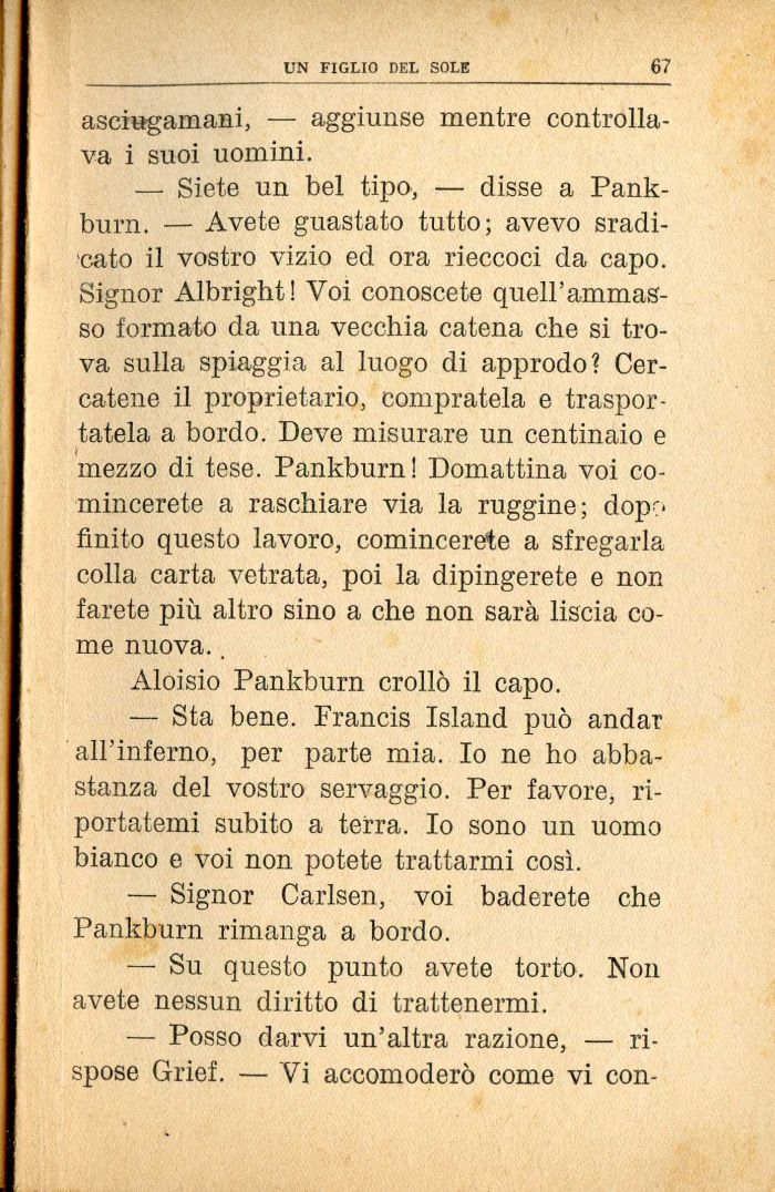 — Siete un bel tipo, — disse a Pank-burn. — Avete guastato tutto; avevo sradicato il vostro vizio ed ora rieccoci da capo. Signor Albright! Voi conoscete quell'ammasso formato da una vecchia catena che si trova sulla spiaggia al luogo di approdo? Cercatene il proprietario, compratela e trasportatela a bordo. Deve misurare un centinaio e mezzo di tese. Pankburn! Domattina voi comincerete a raschiare via la ruggine; dopo finito questo lavoro, comincerete a sfregarla colla carta vetrata, poi la dipingerete e non farete più altro sino a che non sarà liscia come nuova..
