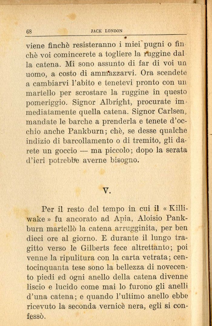 Per il resto del tempo in cui il « Killi-wake » fu ancorato ad Api a, Aloisio Pankburn martellò la catena arrugginita, per ben dieci ore al giorno. E durante il lungo tragitto verso le Gilberts fece altrettanto; poi venne la ripulitura con la carta vetrata ; centocinquanta tese sono la bellezza di novecento piedi ed ogni anello della catena divenne liscio e lucido come mai lo furono gli anelli d'una catena; e quando l'ultimo anello ebbe ricevuto la seconda vernice nera, egli si confessò.