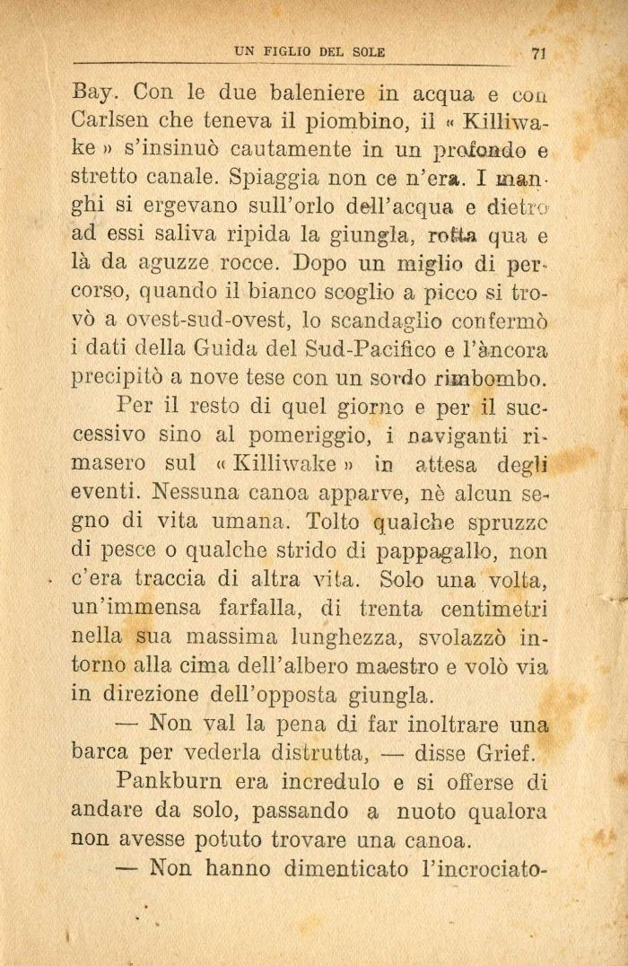 Per il resto di quel giorno e per il successivo sino al pomeriggio, i naviganti rimasero sul « Killiwake » in attesa degli eventi. Nessuna canoa apparve, nè alcun segno di vita umana. Tolto qualche spruzzo di pesce o qualche strido di pappagallo, non c'era traccia di altra vita. Solo una volta, un'immensa farfalla, di trenta centimetri nella sua massima lunghezza, svolazzò intorno alla cima dell'albero maestro e volò via in direzione dell'opposta giungla.