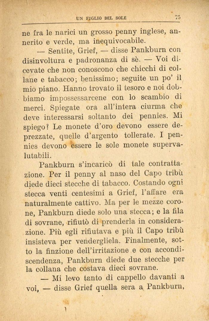 — Sentite, Grief, — disse Pankburn con disinvoltura e padronanza di sè. — Voi dicevate che non conoscono che chicchi di collane e tabacco; benissimo; seguite un po' il mio piano. Hanno trovato il tesoro e noi dobbiamo impossessarcene con lo scambio di merci. Spiegate ora all'intera ciurma che deve interessarsi soltanto dei pennies. Mi spiego? Le monete d'oro devono essere deprezzate, quelle d'argento tollerate. I pennies devono essere le sole monete superva-lutabili.