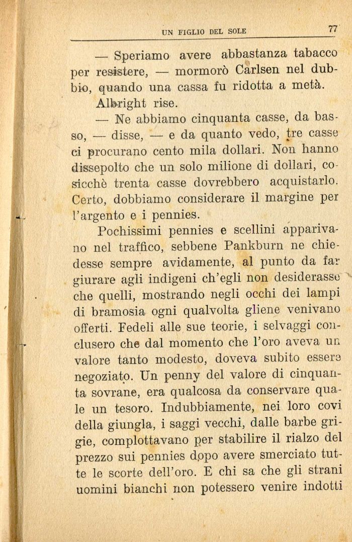 Pochissimi pennies e scellini apparivano nel traffico, sebbene Pankburn ne chiedesse sempre avidamente, al punto da far giurare agli indigeni ch'egli non desiderasse che quelli, mostrando negli occhi dei lampi di bramosia ogni qualvolta gliene venivano offerti. Fedeli alle sue teorie, i selvaggi conclusero che dal momento che l'oro aveva un valore tanto modesto, doveva subito essere negoziato. Un penny del valore di cinquanta sovrane, era qualcosa da conservare quale un tesoro. Indubbiamente, nei loro covi della giungla, i saggi vecchi, dalle barbe grigie, complottavano per stabilire il rialzo del prezzo sui pennies dopo avere smerciato tutte le scorte dell'oro. E chi sa che gli strani uomini bianchi non potessero venire indotti